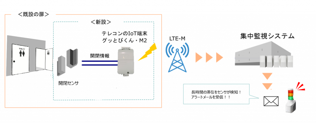 新設・既存問わず、トイレのドアに、開閉センサと通信端末グッとびくん・M2を接続。