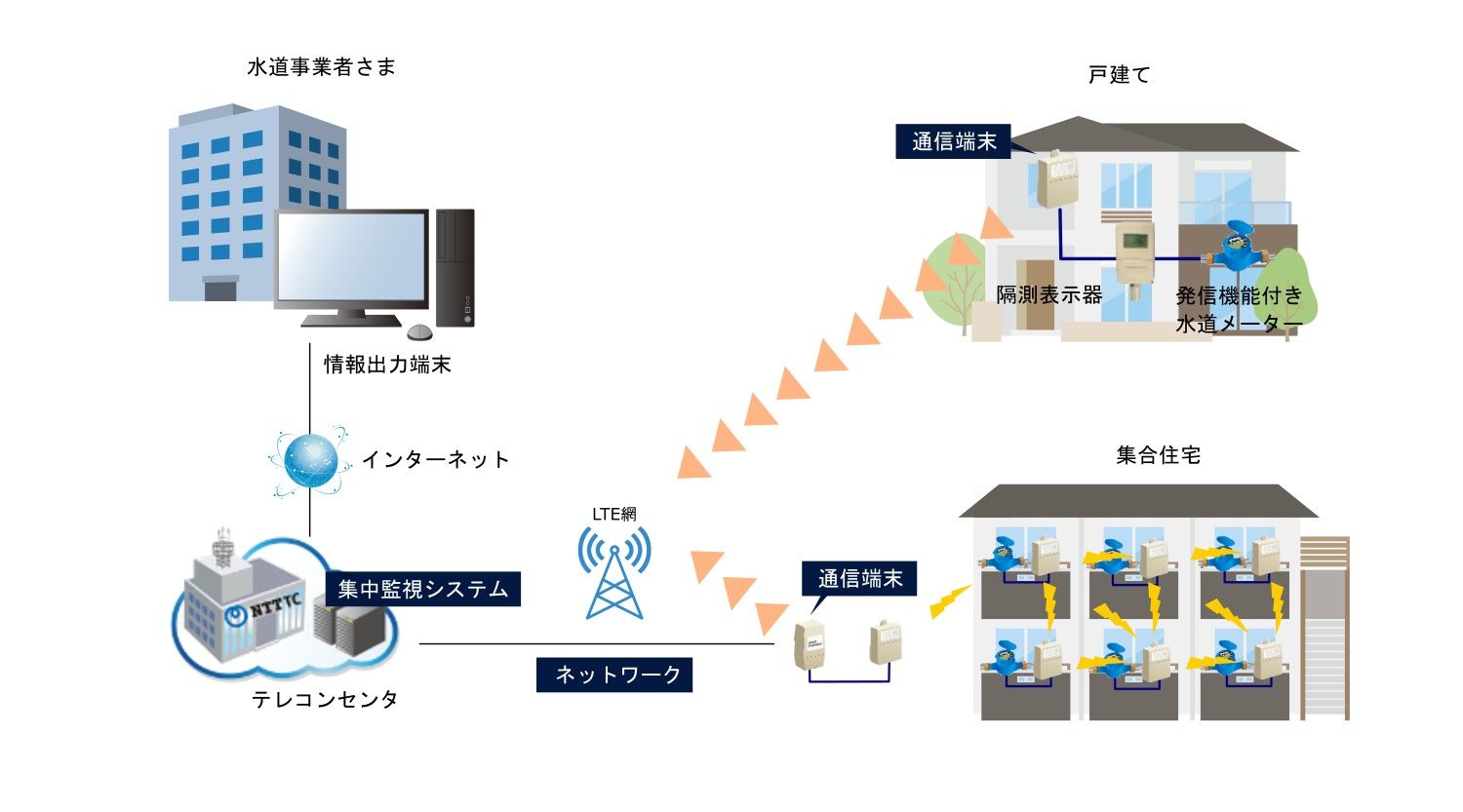発信機能付き水道メータに通信端末を接続し、LTE回線を利用して遠隔で取得したデータを集中監視システム(テレコンセンタ)で管理し、メータから発せられた警報等がどのお客さまの設備かを振分け、水道事業者さまへ通知する仕組みです。